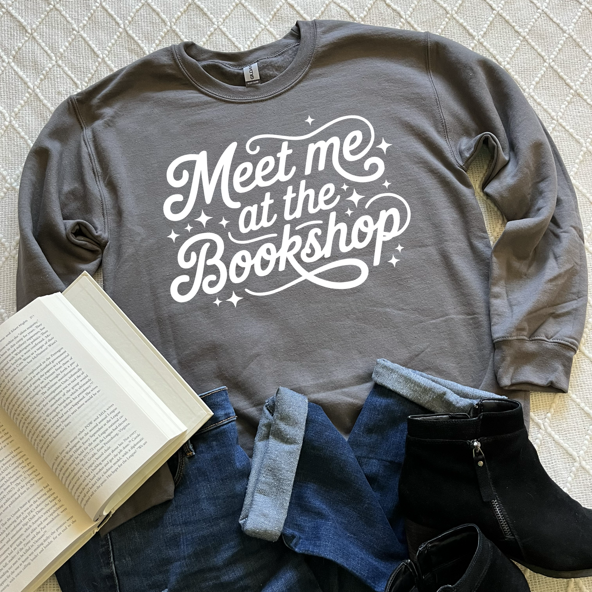 Showcase your love of reading and bookstores with these cozy sweatshirts, featuring the phrase "meet me at the bookshop". Every shirt is hand-pressed and packed in-house, by our small business team.