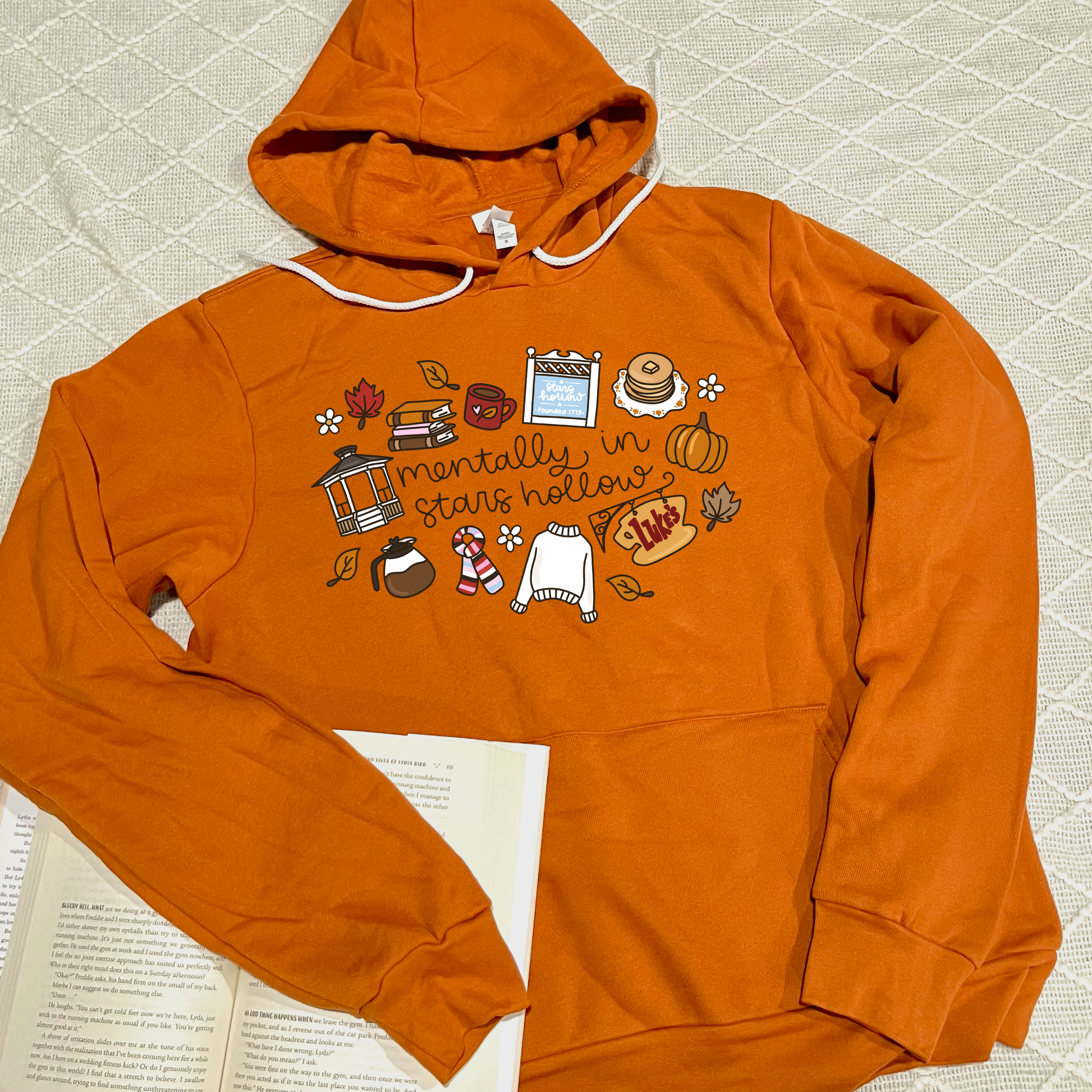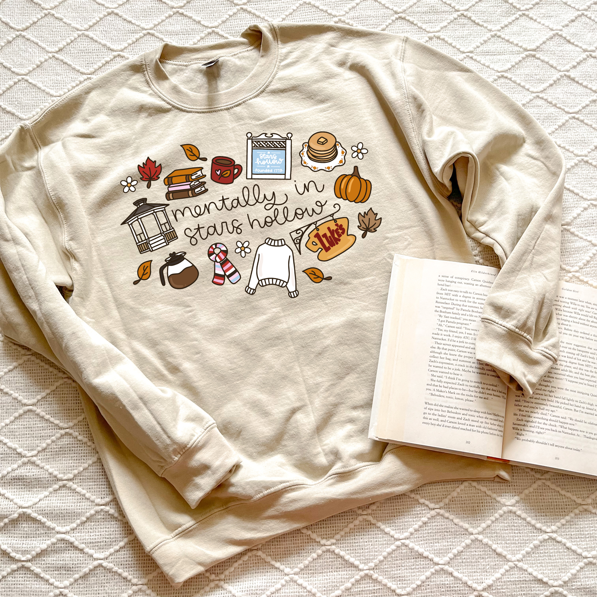 Showcase your love of reading, autumn, and Gilmore Girls with this cozy "mentally in Stars Hollow" sweatshirt. Every shirt is hand-pressed and packed in-house, by our small business team.