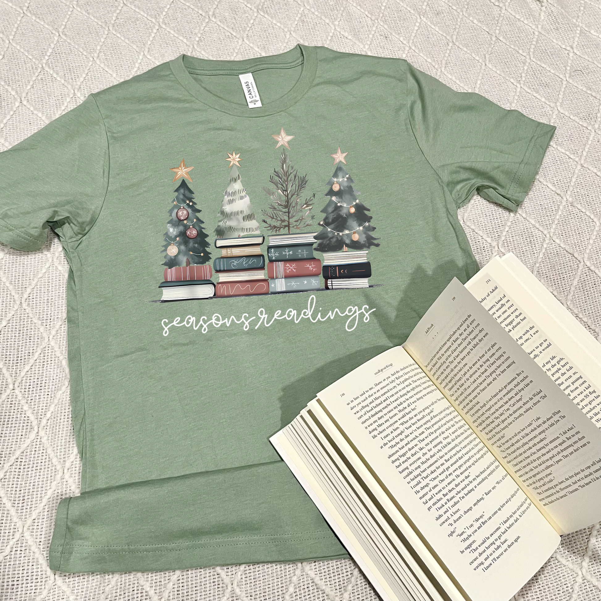 Showcase your love of reading and Christmas with these cozy t-shirts, featuring Christmas trees on books with the phrase "season's readings". Every shirt is hand-pressed and packed in-house, by our small business team.